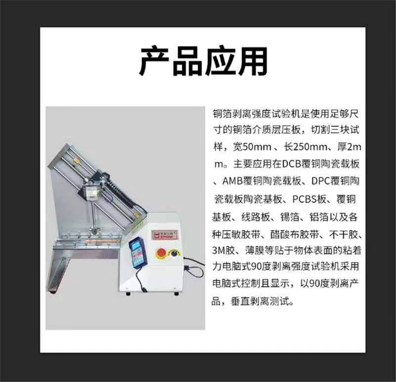電腦控制銅箔剝離強度測試儀用于測試覆銅層壓板和印刷線路板工業(yè)的試驗室中測量剛性板上銅箔或者柔性板上銅箔的抗剝離力、剝離強度、平均剝離力、平均剝離強度等。銅箔剝離強度試驗機是使用足夠尺寸的銅箔介質層壓板,切割三塊試樣,寬50mm 、長250mm、厚2mm。主要應用在DCB覆銅陶瓷載板、AMB覆銅陶瓷載板、DPC覆銅陶瓷載板陶瓷基板、PCBS板、覆銅基板、線路板、錫箔、鋁箔以及各種壓敏膠帶、醋酸布膠帶、不干膠、3M膠、薄膜等貼于物體表面的粘著力電腦式90度剝離強度試驗機采用電腦式控制且顯示,以90度剝離產(chǎn)品,垂直剝離測試。